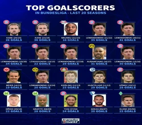 体育播报5月20日宣 本赛季凯恩以26球蝉联德甲射手王,德转也盘点了德甲近20个赛季最佳射手,具体如下: